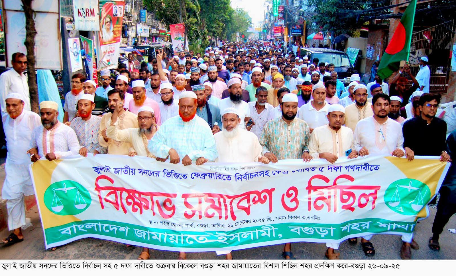 জুলাই সনদের আইনী ভিত্তি প্রদান, পি আর পদ্ধতিতে জাতীয় সংসদ নির্বাচনসহ ৫ দফা দাবীতে বগুড়ায় বিক্ষোভ মিছিল ও সমাবেশ করেছে জামায়াতে ইসলামী। কেন্দ্রিয় কর্মসূচির অংশ হিসেবে শুক্রবার বিকেলে স্থানীয় শহীদ খোকন পার্কে বগুড়া শহর জামায়াতের উদ্যোগে বিক্ষোভ সমাবেশ অনুষ্ঠিত হয়। শহর জামায়াতের আমির ও বগুড়া-৬ (সদর) আসনের সংসদ সদস্য পদপ্রার্থী অধ্যক্ষ মাওলানা আবিদুর রহমান সোহেলের সভাপতিত্বে বিক্ষোভ সমাবেশে বক্তব্য রাখেন শহর সেক্রেটারি অধ্যাপক আ.স.ম আব্দুল মালেক, কর্মপরিষদ সদস্য এ্যাড. রিয়াজ উদ্দিন, বাংলাদেশ শ্রমিক কল্যান ফেডারেশন কেন্দ্রীয় সহ সাধারন সম্পাদক অধ্যাপক আব্দুল মতিন, শহর জামায়াতের সহকারী সেক্রটারী অধ্যাপক রফিকুল আলম, শিবিরের বগুড়া শহর শাখার সাবেক সভাপতি এ্যাড. আলাউদ্দিন সোহেল, শহর জামায়াতের সহকারী সেক্রটারী মোঃ আল- আমিন, শ্রমিক কল্যান ফেডারেশন বগুড়া শহর শাখার সভাপতি আজগর আলী, শহর জামায়াতের অফিস সম্পাদক মাওঃ আব্দুল হামিদ বেগ, শহর শিবির সভাপতি হাবিবুল্লাহ খন্দকার, শহর জামায়াতের আইন সম্পাদক আইন সম্পাদক এ্যাড. শাহিন মিয়া, যুব ও ক্রীড়া সম্পাদক আব্দুস সালাম তুহিন, মাওলানা মাওঃ আব্দুস সালাম যুক্তিবাদী, মাওলানা হেদাইতুল ইসলাম, এ্যাড. নূরুল ইসলাম আকন্দ, আব্দুল হাদী শফিক, এনামুল হক রানা, আল জাবের হক্কানী প্রমূখ। বক্তারা বলেন, জুলাই অভ্যুত্থানের মাধ্যমে দেশে একটি নতুন পরিবেশ সৃষ্টি হয়েছে। অতীতের ভুল থেকে শিক্ষা নিয়ে নতুন বাংলাদেশ গড়ার যে সম্ভাবনা দেখা দিয়েছে, সেই সম্ভাবনাকে কাজে লাগিয়ে একটি সুখী, সমৃদ্ধশালী, মানবিক বাংলাদেশ গড়ার লক্ষ্যে জামায়াতে ইসলামী কাজ করছে। মানুষের ভোটাধিকার ফিরিয়ে দিতে এবং প্রতিটি ভোটের যথাযথ মূল্যায়নের জন্যই জামায়াতে ইসলামীসহ অধিকাংশ রাজনৈতিক দল পি আর পদ্ধতিতে নির্বাচনের দাবী জানাচ্ছে। আমরা মনেকরি যারা বিরোধীতা করছেন তারাও একদিন পি আর পদ্ধতির সুফল বুঝতে সক্ষম হবেন এবং এই দাবী মেনে নিয়েই আগামী সংসদ নির্বাচনে অংশগ্রহন করবেন। সমাবেশ শেষে বিশাল বিক্ষোভ মিছিল শহরের প্রধান প্রধান সড়ক প্রদক্ষিন করে।