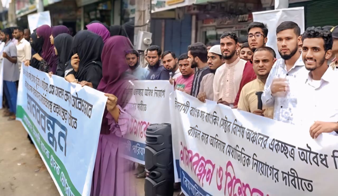 ঠাকুরগাঁওয়ের রাণীশংকৈল পৌরশহরে সোমবার (৬ অক্টোবর) ইসলামী ব্যাংকসহ ব্যাংকিং সেক্টরে বিশেষ অঞ্চলের একচ্ছত্র অবৈধ নিয়োগ বাতিল করে মেধাভিক্তিক নিয়োগ প্রদানের দাবীতে বিক্ষোভ সমাবেশ ও মানববন্ধন করেছে বৈষম্যবিরোধী চাকুরী প্রত্যাশী পরিষদ ও ইসলামী ব্যাংক গ্রাহক ফোরাম।