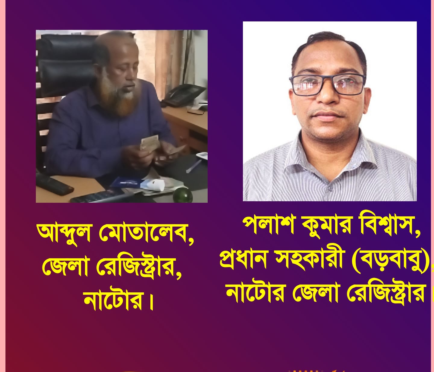 বর্তমানে দুর্নীতিবাজ জেলা রেজিস্ট্রার আব্দুল মোতালেব এর ঘুষ দুর্নীতি আর জাল জালিয়াতির কারণে অতিষ্ঠ গোটা নাটরবাসী।।
