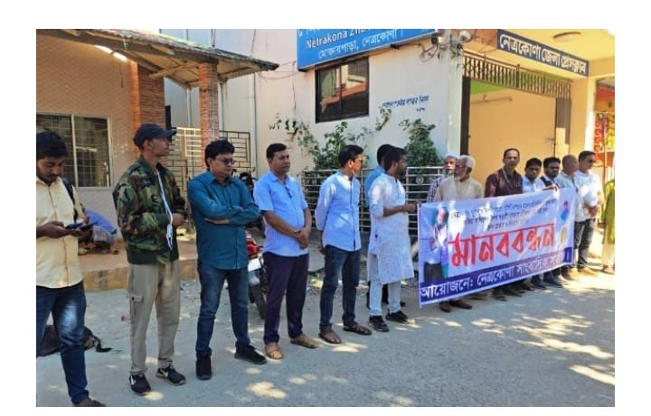 ৭ নভেম্বর শহরের মুক্তার পাড়া এলাকার জেলা প্রেস ক্লাবের সামনের সড়কে সকাল ১১ টায় – নেত্রকোনায় সাংবাদিক লুৎফুজ্জামান আলিফ ফকিরের ওপর হিংস্র হামলার ঘটনার প্রতিবাদে এবং উক্ত হামলায় জড়িত আসামিদের দ্রুত গ্রেপ্তার করে আইনের আওতায় এনে দৃষ্টান্তমূলক শাস্তির দাবিতে মানববন্ধন অনুষ্ঠিত হয়েছে।