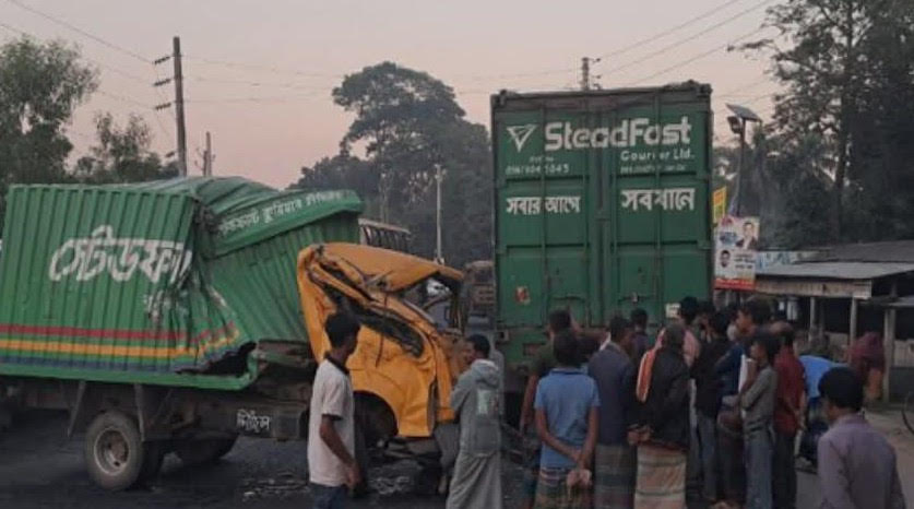 প্রত্যক্ষদর্শী ও হাইওয়ে থানা সূত্রে জানা যায়, স্টেড ফাস্ট কুরিয়ার সার্ভিসের একটি কাভার্ডভ্যান আরেকটি নষ্ট কাভার্ডভ্যানকে পিছনে চেইন দিয়ে টেনে ঢাকার দিকে নিয়ে যাচ্ছিল। তারা মকবুলের দোকান বাসস্ট্যান্ড এলাকায় পৌঁছালে হঠাৎ চেইনটি ছিঁড়ে যায়। এতে পিছনের নষ্ট কাভার্ডভ্যানটি সড়কের মাঝখানে চলে আসে এবং বিপরীত দিক থেকে আসা ঈগল পরিবহনের একটি যাত্রীবাহী বাসের সঙ্গে মুখোমুখি সংঘর্ষ হয়। সংঘর্ষের পর ঈগল পরিবহনের বাসটির সামনের অংশ মারাত্মকভাবে থেঁতলে যায়। নিয়ন্ত্রণ হারিয়ে বাসটি সড়কের পাশে থাকা বাসস্ট্যান্ডে উঠে গিয়ে দাঁড়িয়ে থাকা চারটি ব্যাটারিচালিত রিকশা ও একটি অটোরিকশা ক্ষতিগ্রস্ত হয়।