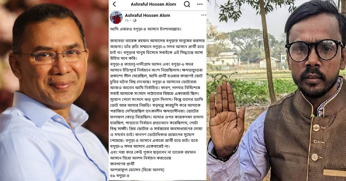 শনিবার বিকেলে নিজের ভেরিফায়েড ফেসবুকে এক পোস্টে নির্বাচনে প্রার্থী হওয়ার ঘোষণা দেন হিরো আলম। একতারা হাতে নেওয়া ছবির সঙ্গে তিনি লিখেছেন, আমি এবারও বগুড়া-৪ আসনে ইনশা আল্লাহ। ফেসবুক পোস্টে হিরো আলম বলেন, জননেতা তারেক রহমান আমাদের বগুড়ার মানুষের ভরসার জায়গা। তার প্রতি সম্মানে বগুড়া-৬ সদর আসনে প্রার্থী হতে চাই না। বগুড়ার মানুষ হিসেবে সবাইকে এই সিদ্ধান্তে আসা উচিত মনে করি।