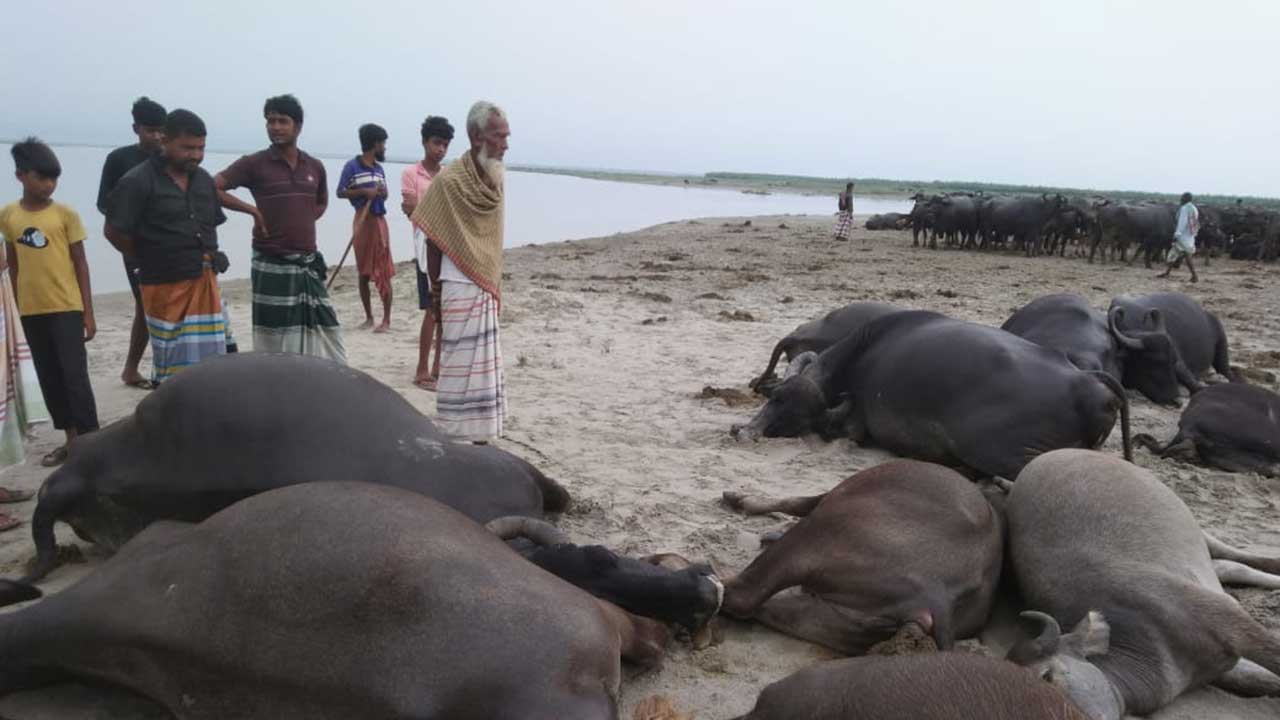 প্রাণিসম্পদ বিভাগ ও স্থানীয় সূত্রে জানা গেছে, বাংলাবাজার এলাকার নওয়াজুদ্দিনের ছেলে নবির আলীর ১০টি মহিষ এবং একই এলাকার এলাহি ঢালির একটি মহিষ বজ্রপাতে মারা যায়। এসময় মহিষগুলো নদীর পাড়ের উঁচু স্থানে আশ্রয়ে ছিল।
