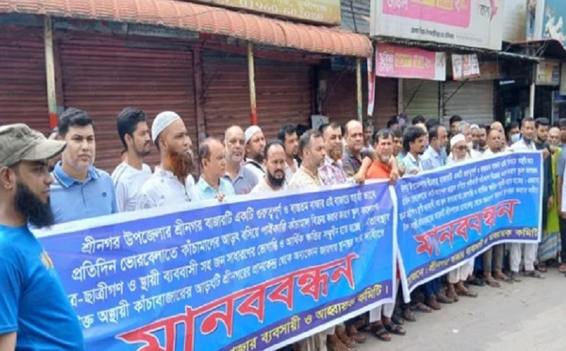 আজ বৃহস্পতিবার, ২৮ আগষ্ট, ২০২৫, সকাল ১০টায় শ্রীনগর সহকারী পুলিশ সুপারের কার্যালয়ের সামনে, শ্রীনগর-দোহার সড়কে এই মানববন্ধন অনুষ্ঠিত হয়। এতে শ্রীনগর বাজারের বিভিন্ন শ্রেণির ব্যবসায়ীরা অংশ নেন।