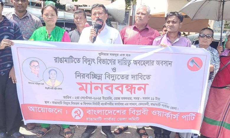 রাঙামাটিতে নিরবচ্ছিন্ন বিদ্যুতের দাবিতে মানববন্ধন করেছে বাংলাদেশের বিপ্লবী ওয়ার্কার্স পার্টি। মঙ্গলবার (২ সেপ্টেম্বর) সকাল ১১টায় পার্বত্য জেলা কমিটির উদ্যোগে শহরের ভেদভেদী এলাকায় বিদ্যুৎ বিতরণ ও বিপণন নির্বাহী প্রকৌশলীর কার্যালয়ের সামনে এ কর্মসূচি অনুষ্ঠিত হয়।