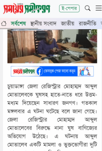 সূত্রের খবর, চুয়াডাঙ্গা জেলা রেজিস্ট্রার হিসেবে মোহাম্মদ আব্দুল মোতালেব ২০২৩ সালের ১৩ জুন দায়িত্ব নেন। দায়িত্ব নেয়ার শুরু থেকেই তার বিরুদ্ধে ওঠে নানা অভিযোগ। জেলা আইনশৃঙ্খলা কমিটির সভাতেও জেলা রেজিস্ট্রার মোহাম্মদ আব্দুল মোতালেবের ঘুষ বাণিজ্যের বিষয়টি একাধিকবার উঠে এসছে বলে জানান আমাদের প্রতিনিধি বিশাল রহমান।